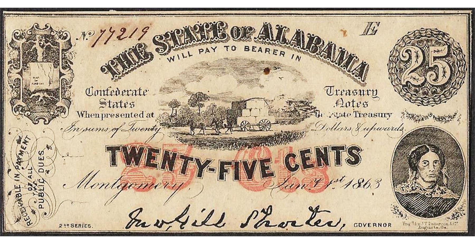 One 1863 Twenty Five Cents The State of Alabama Obsolete Note.