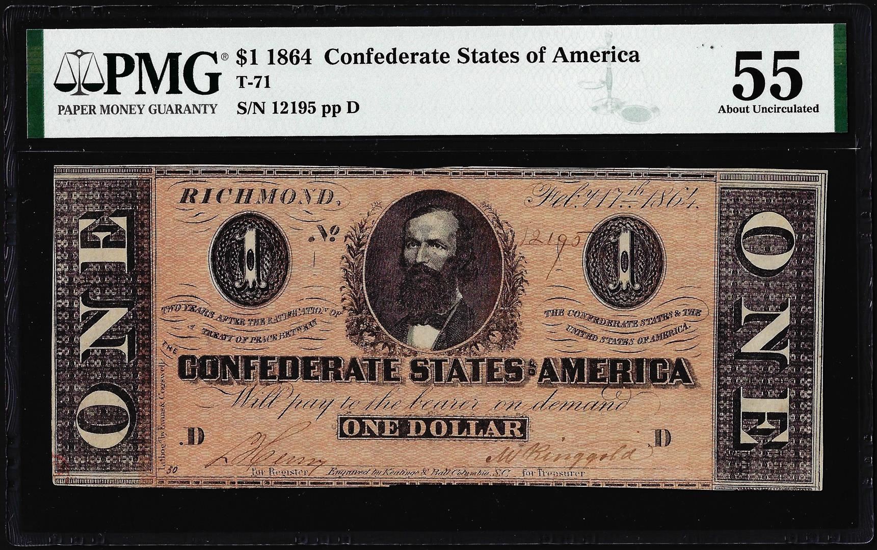 1864 $1 Confederate States of America Note T-71 PMG About Uncirculated 55
