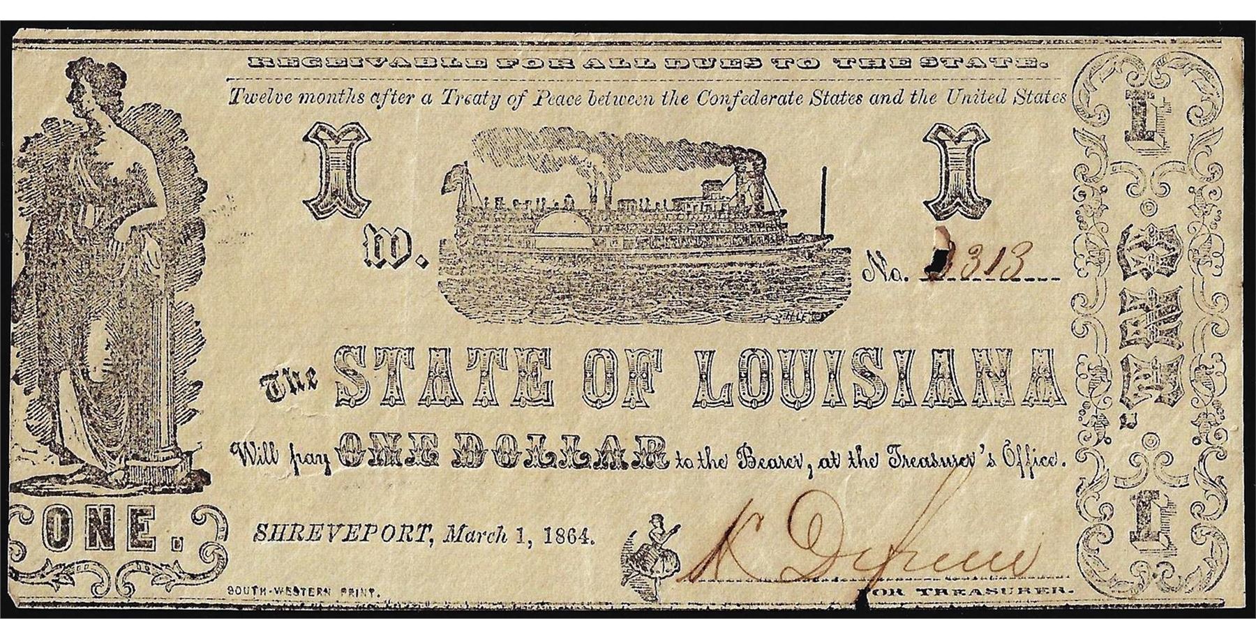 One 1864 $1 State of Louisiana Obsolete Note.