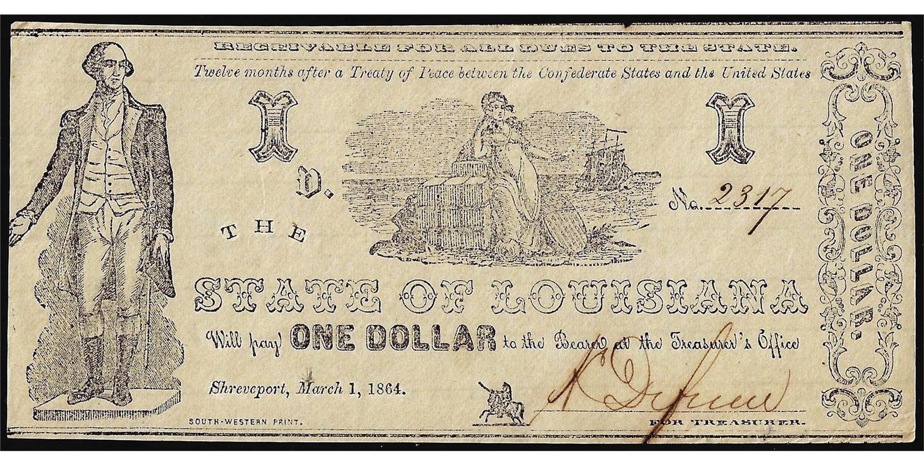 One 1864 $1 State of Louisiana Obsolete Note.