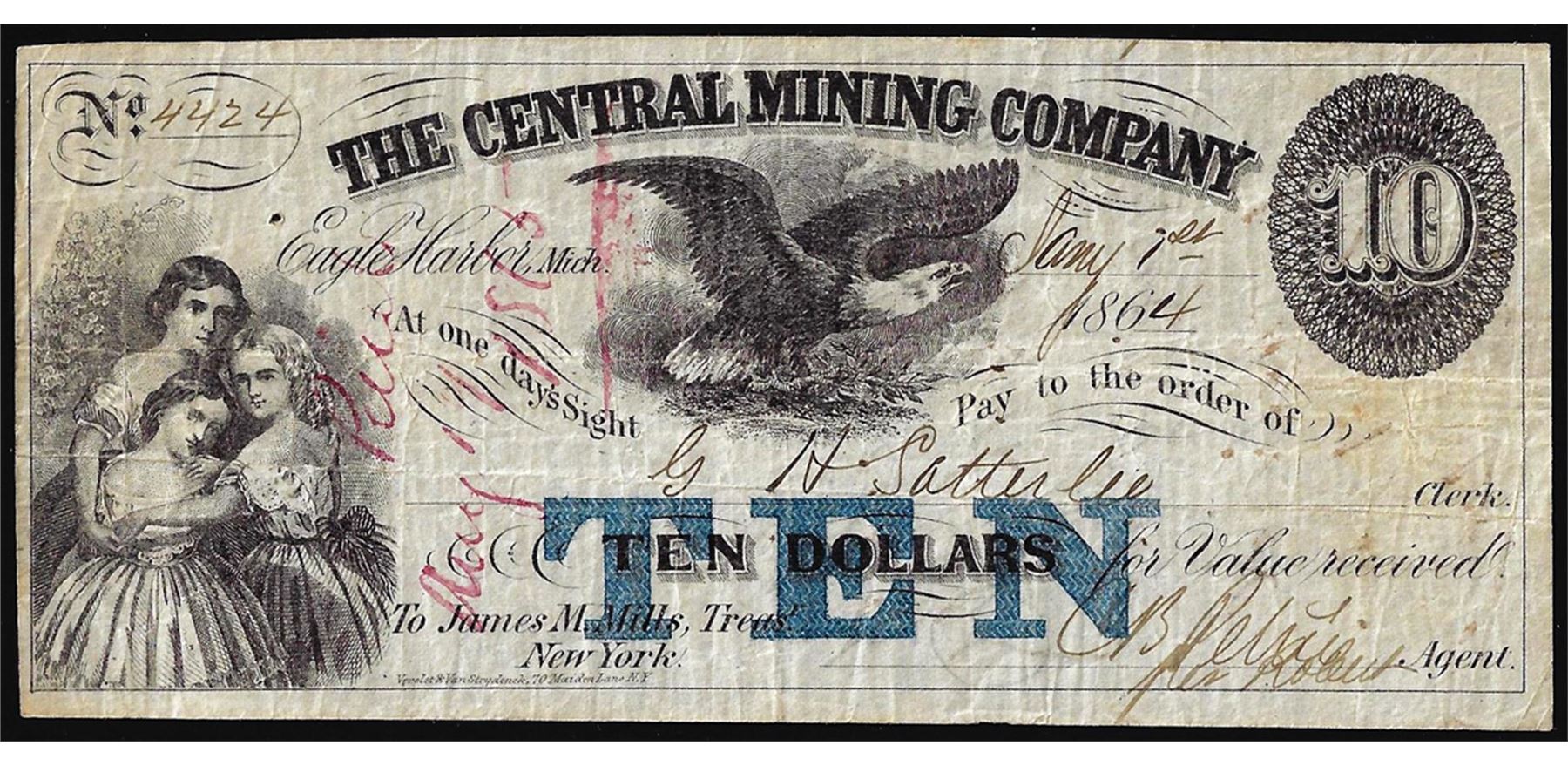 One 1864 $10 Central Mining Company Eagle Harbor, Michigan Obsolete Note.