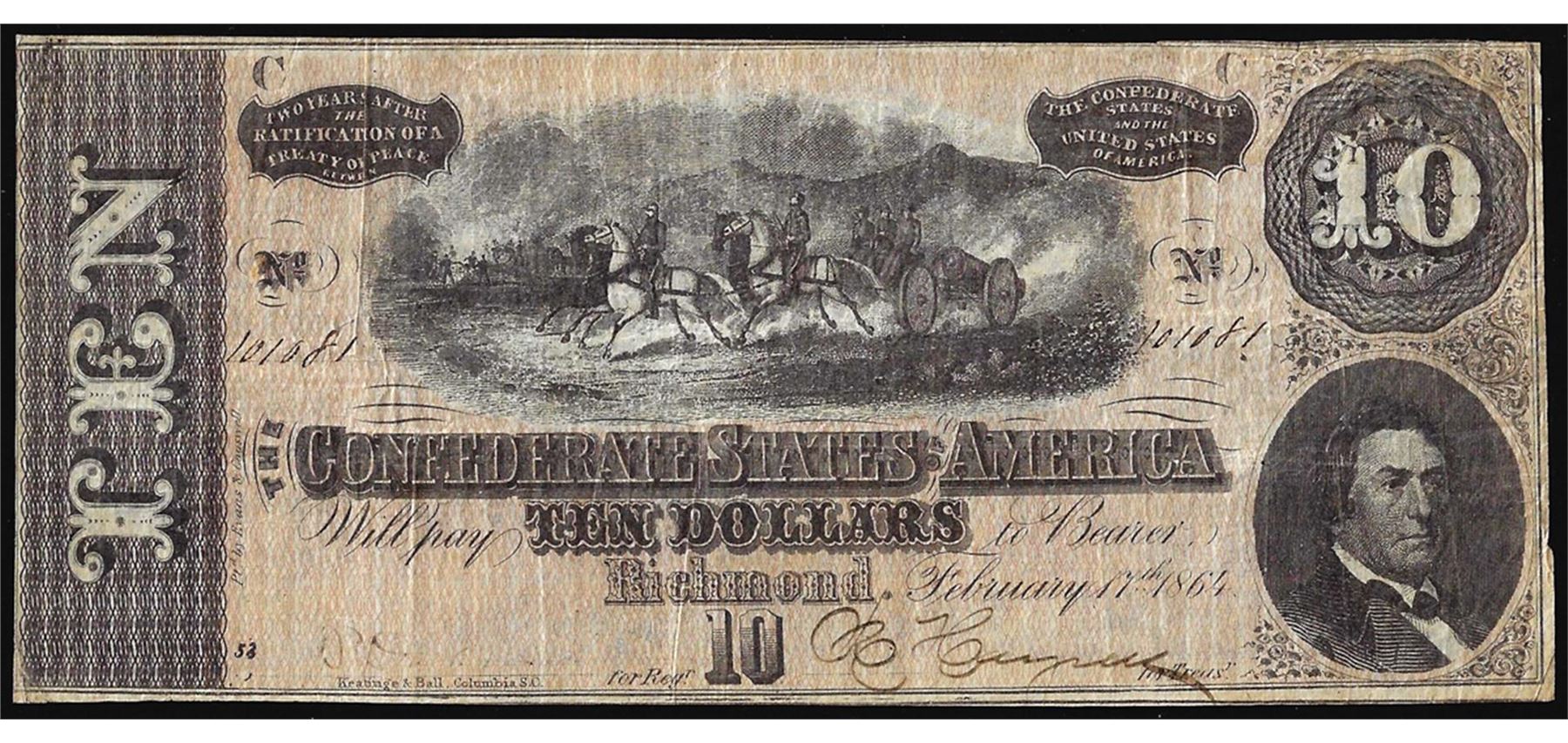 One 1864 $10 Confederate States Note Richmond Signed by J.J. Hartsfield.