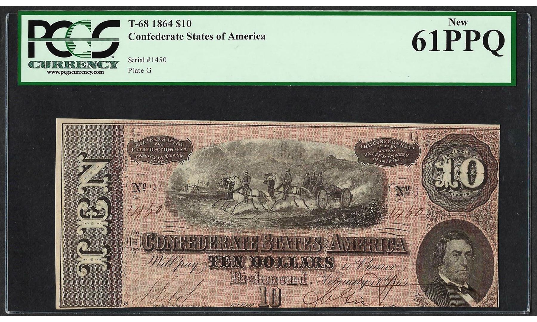 One 1864 $10 Confederate States of America Note T-68 PCGS New 61PPQ. PCGS Graded.
