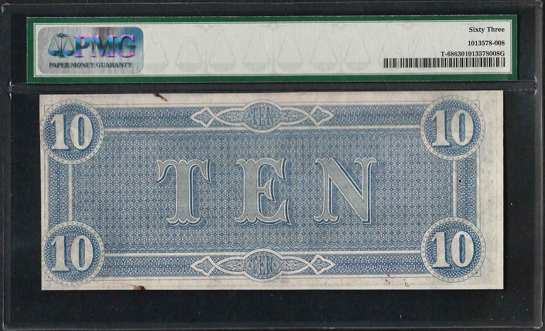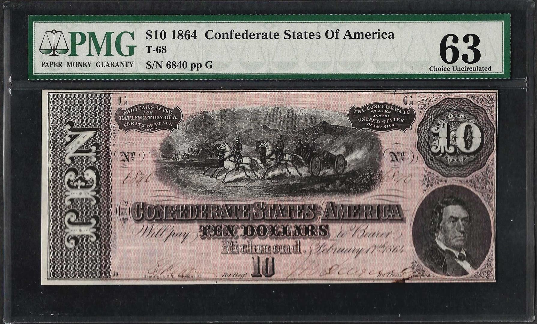 One 1864 $10 Confederate States of America Note T-68 PMG Choice Uncirculated 63. PMG Certified.