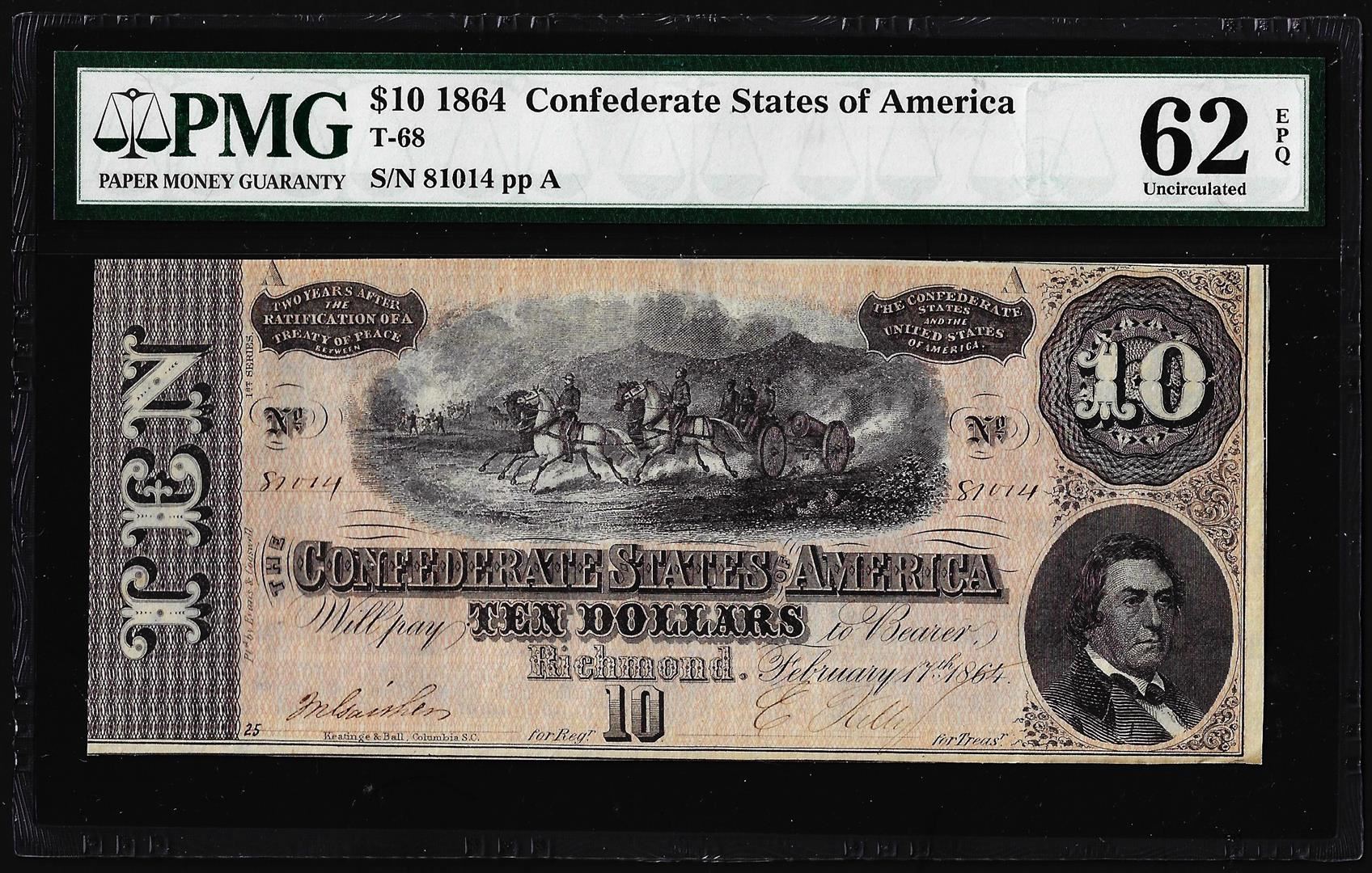 1864 $10 Confederate States of America Note T-68 PMG Uncirculated 62EPQ