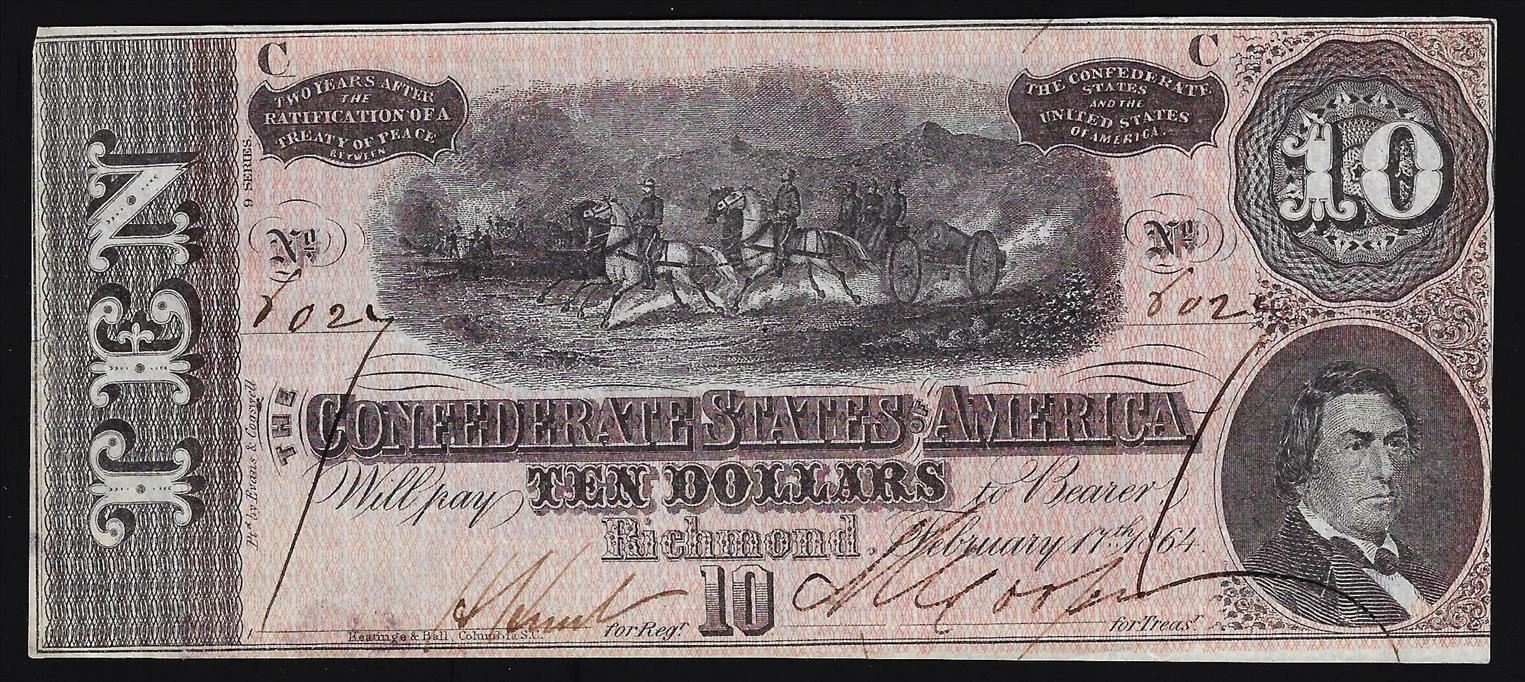 One 1864 $10 Confederate States of America Note.