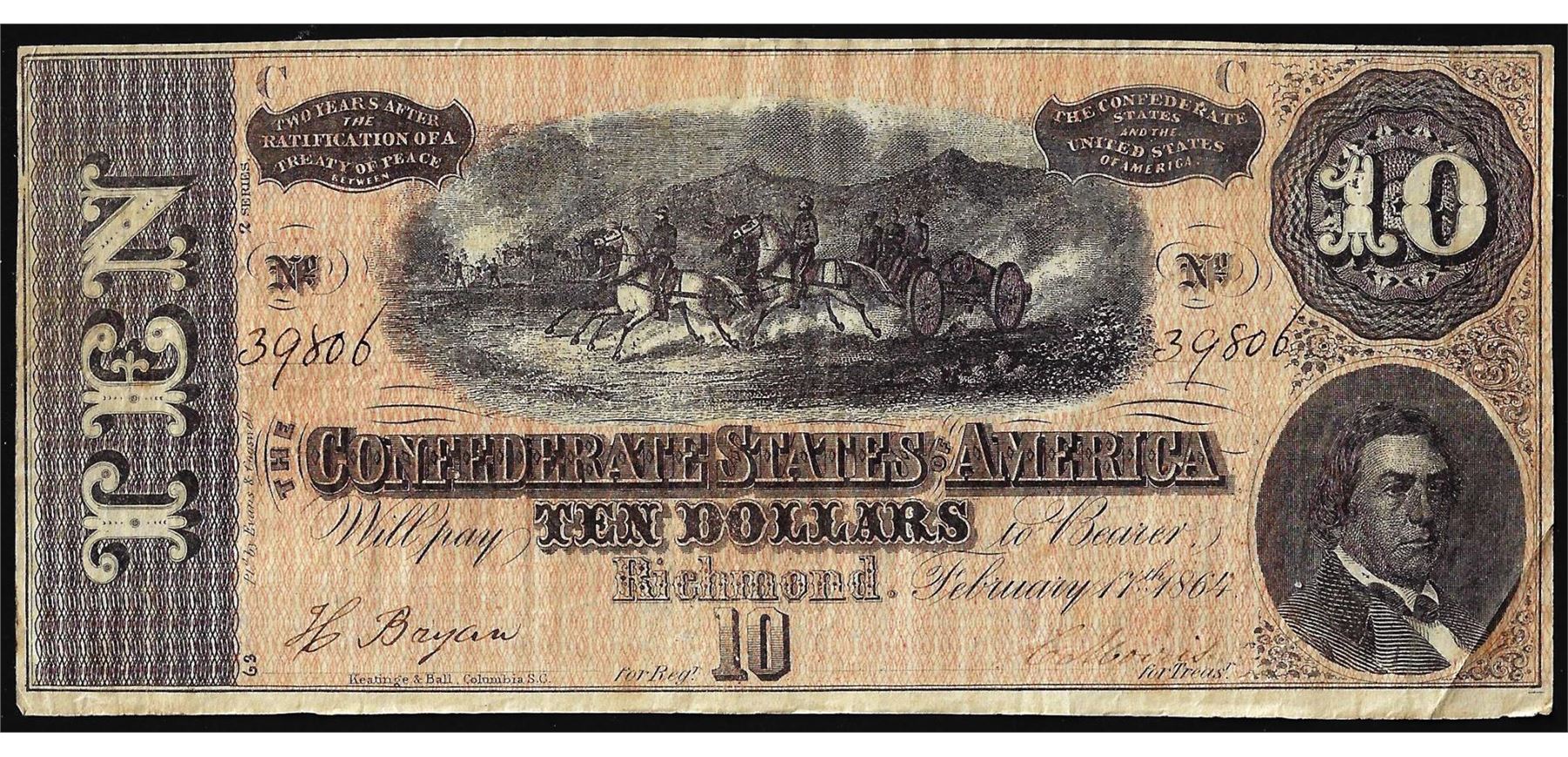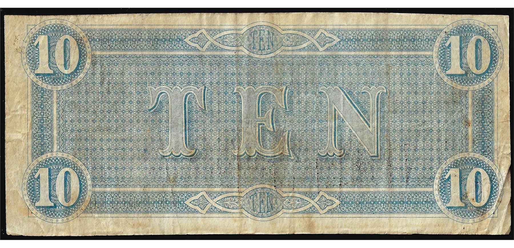 One 1864 $10 Confederate States of America Note.
