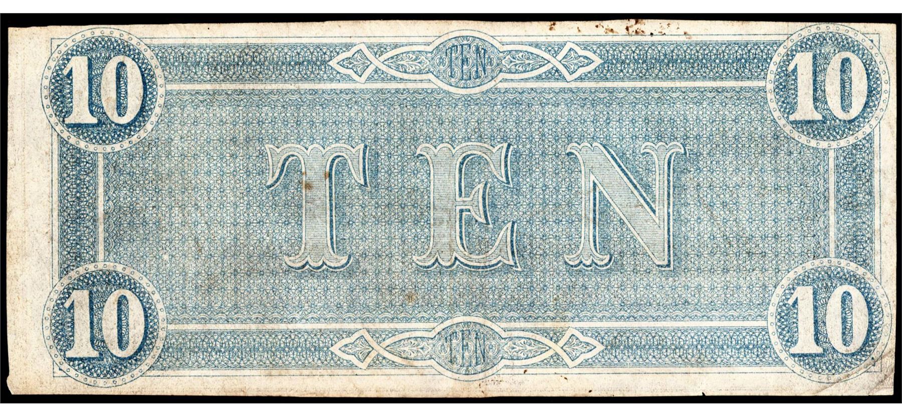 One 1864 $10 Confederate States of America Note.