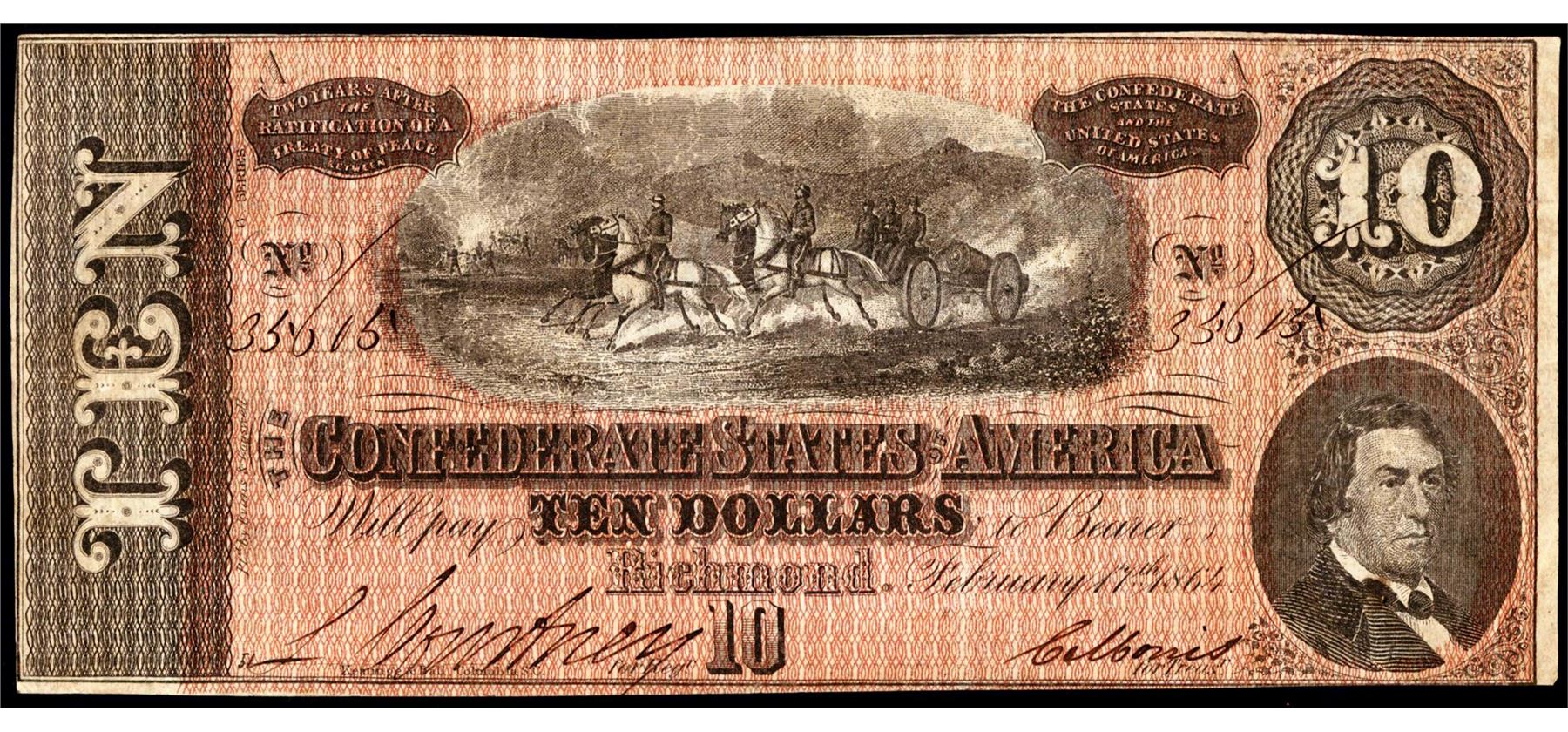 One 1864 $10 Confederate States of America Note.
