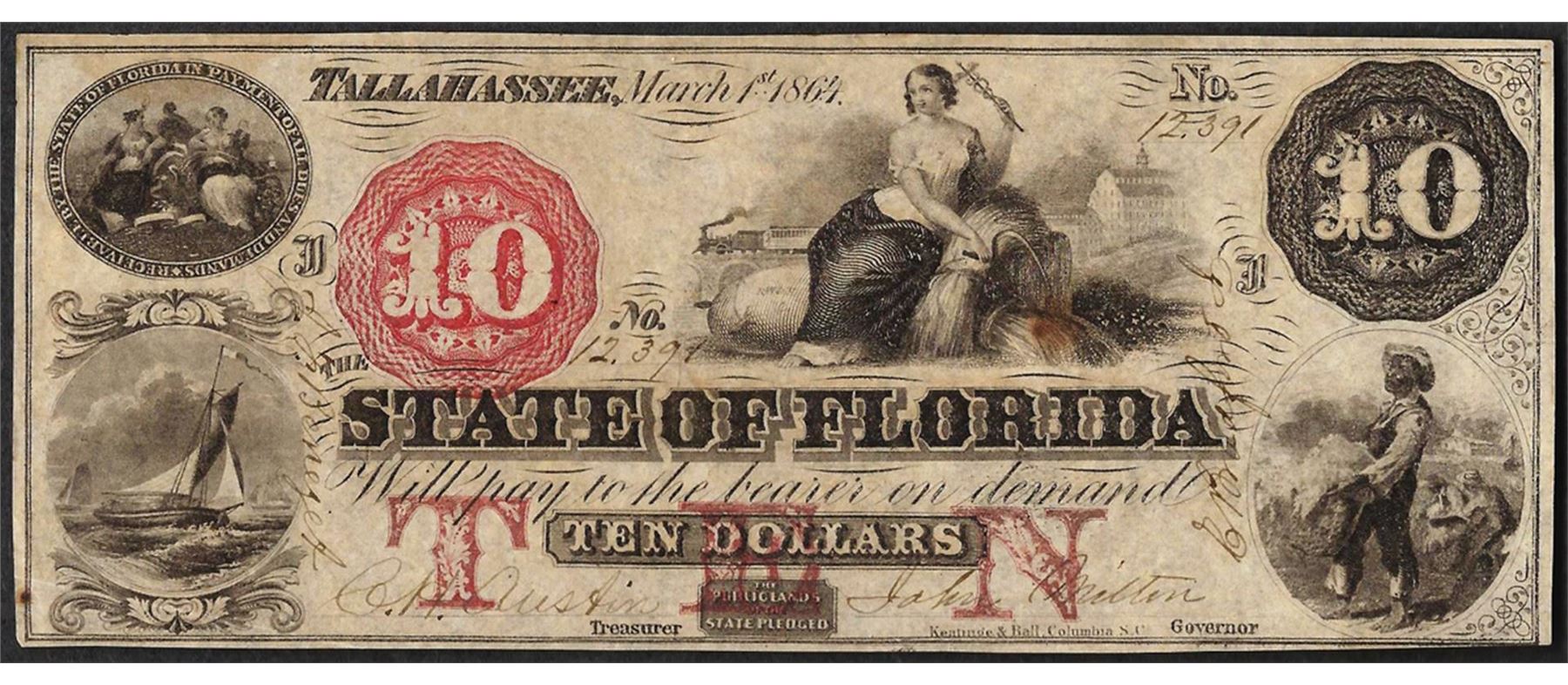 One 1864 $10 State of Florida Tallahassee Obsolete Bank Note.