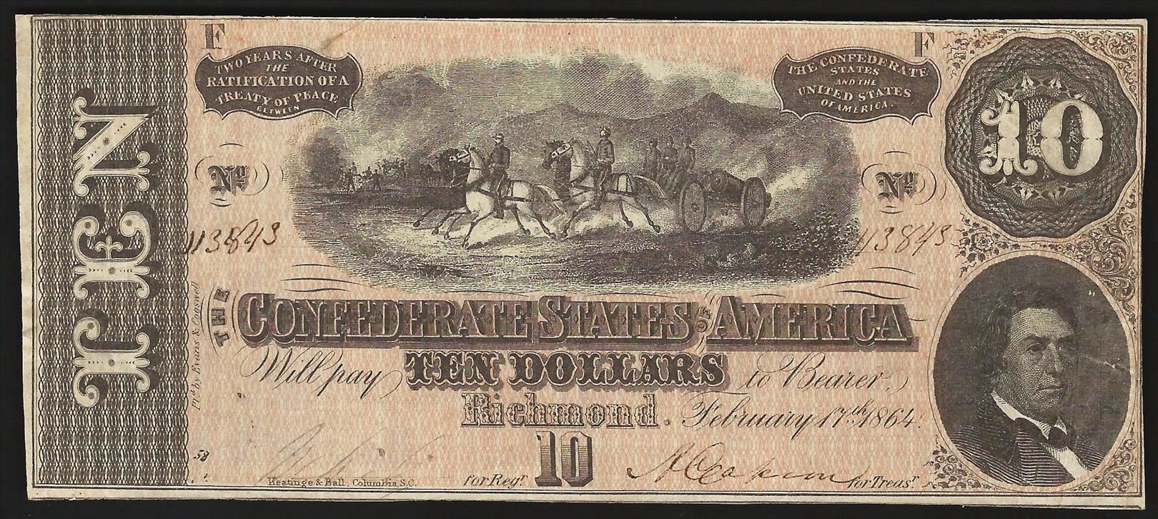 One 1864 $10 The Confederate States of America Note .