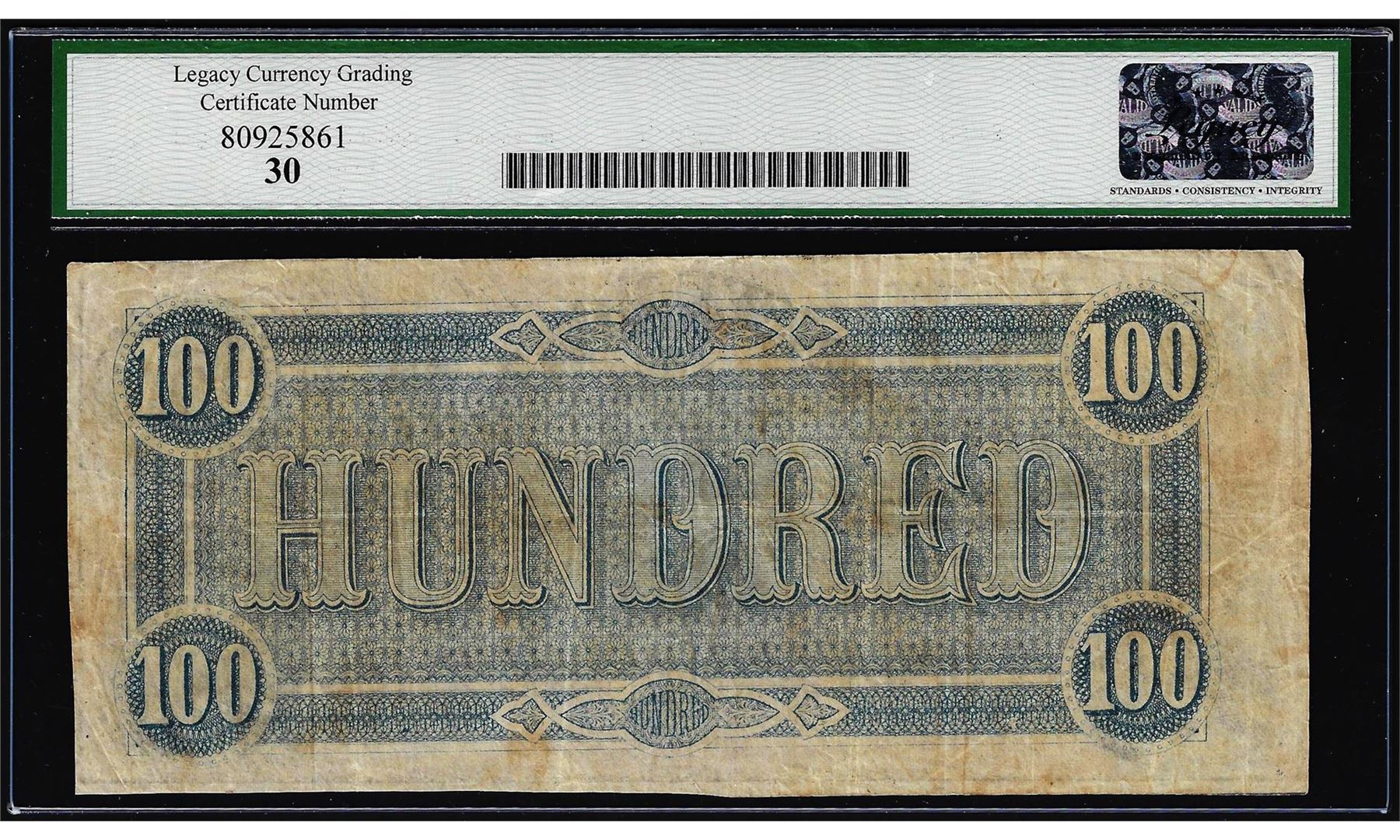 One 1864 $100 Confederate States of America Note T-65 Legacy Very Fine 30. Legacy Graded.