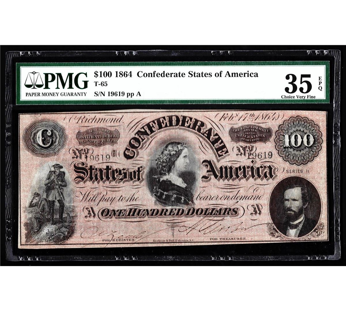 1864 $100 The Confederate States of America Note PMG Choice VF 35EPQ