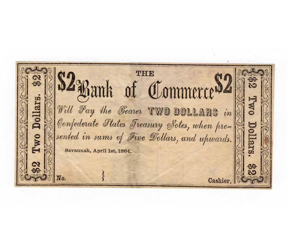 One 1864 $2 Bank of Commerce Confederate Currency Note.
