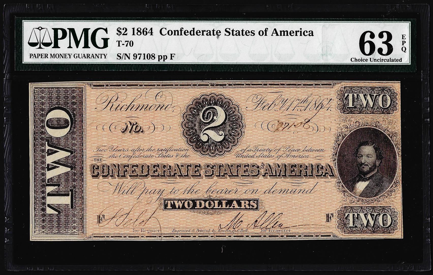 One 1864 $2 Confederate States of America Note T-70 PMG Choice Uncirculated 63EPQ. PMG Certified.