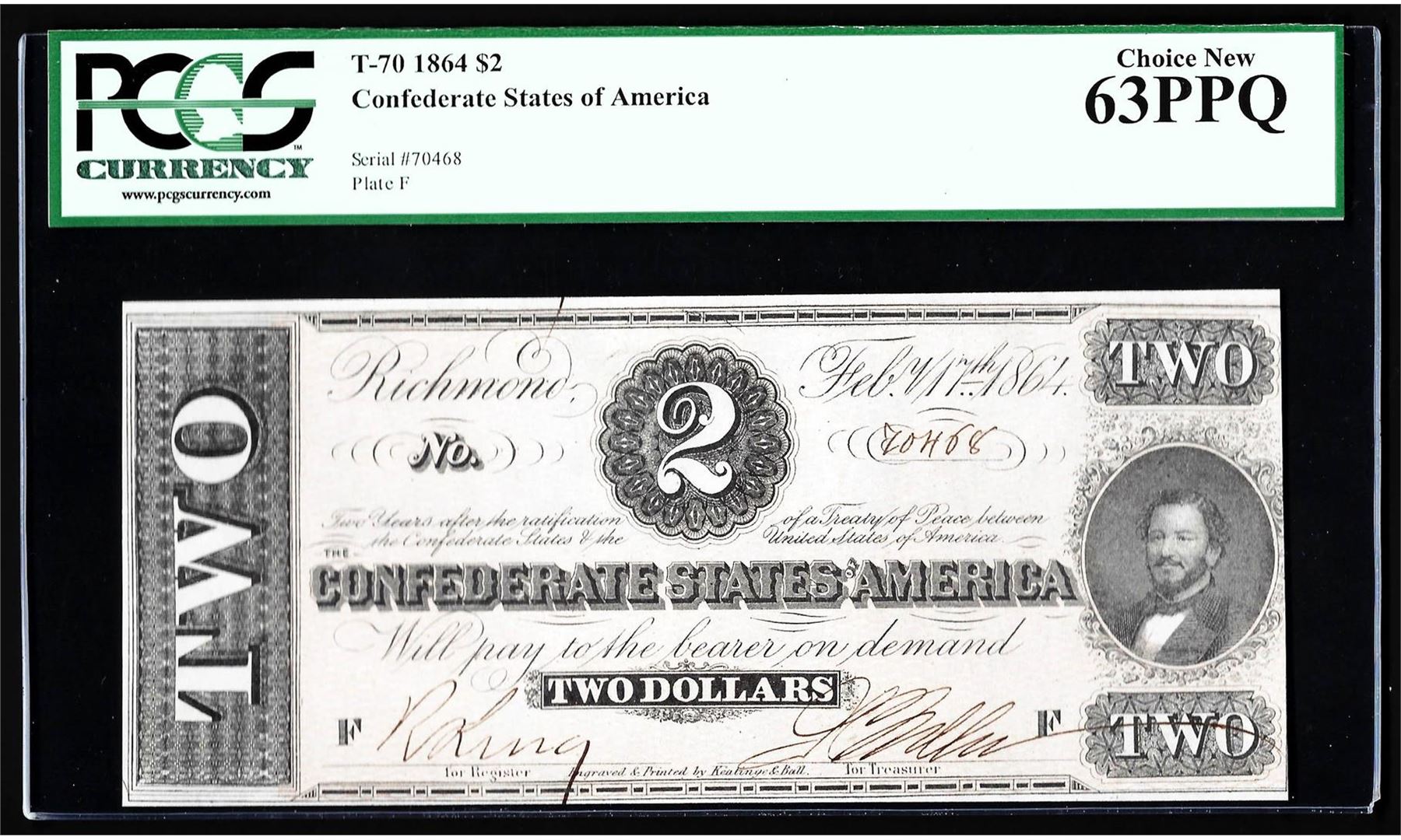 One 1864 $2 The Confederate States of America Note PCGS Choice New 63PPQ. PCGS Graded.