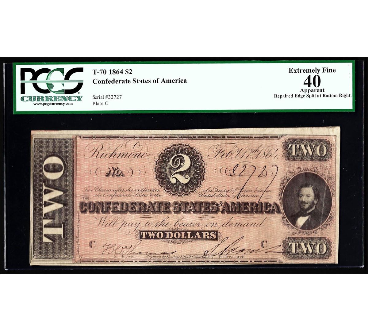 One 1864 $2 The Confederate States of America Note PCGS XF40 Apparent. PCGS Graded.