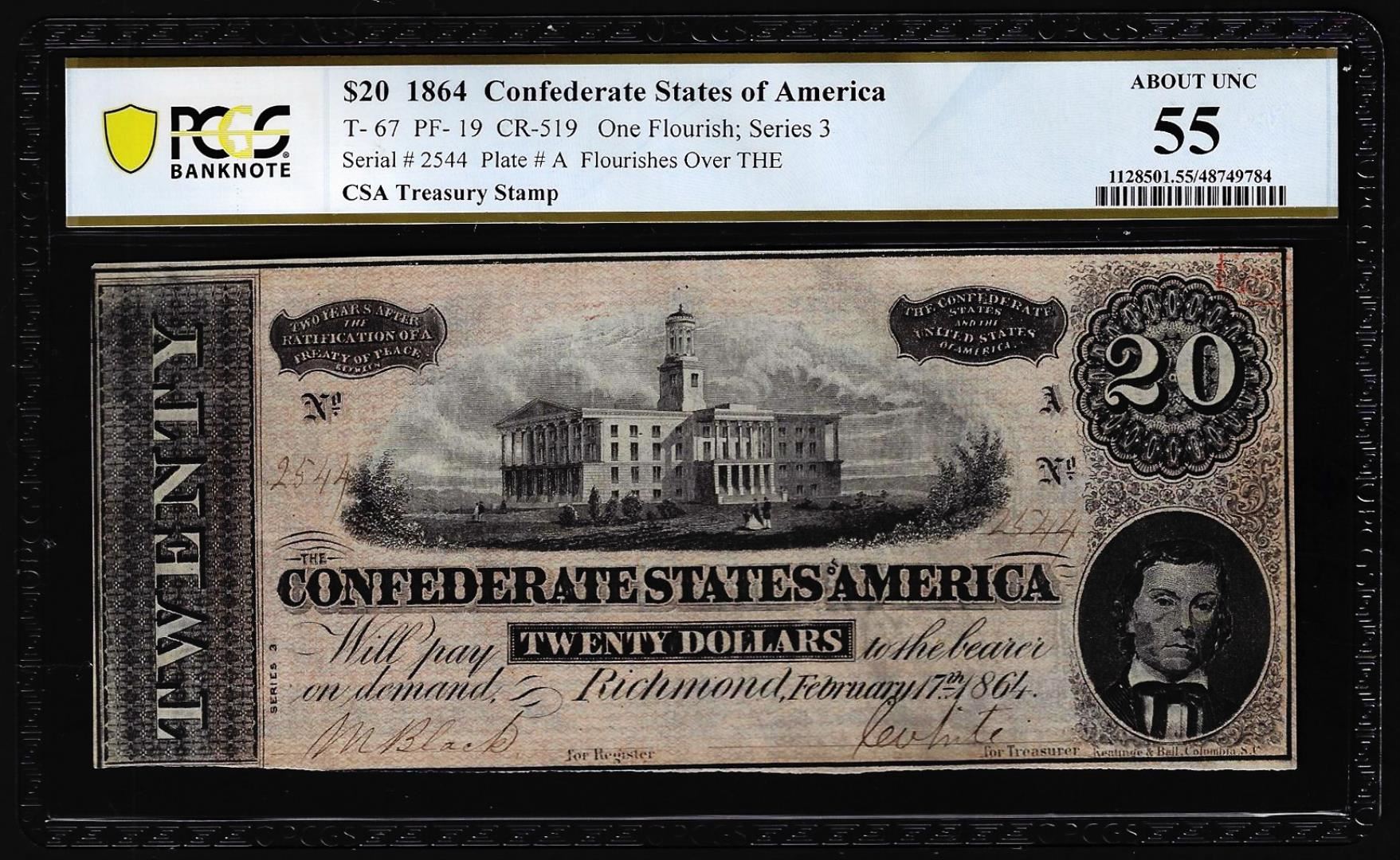 1864 $20 Confederate States of America Note T-67 PCGS About Unc 55 CSA Treasury Stamp