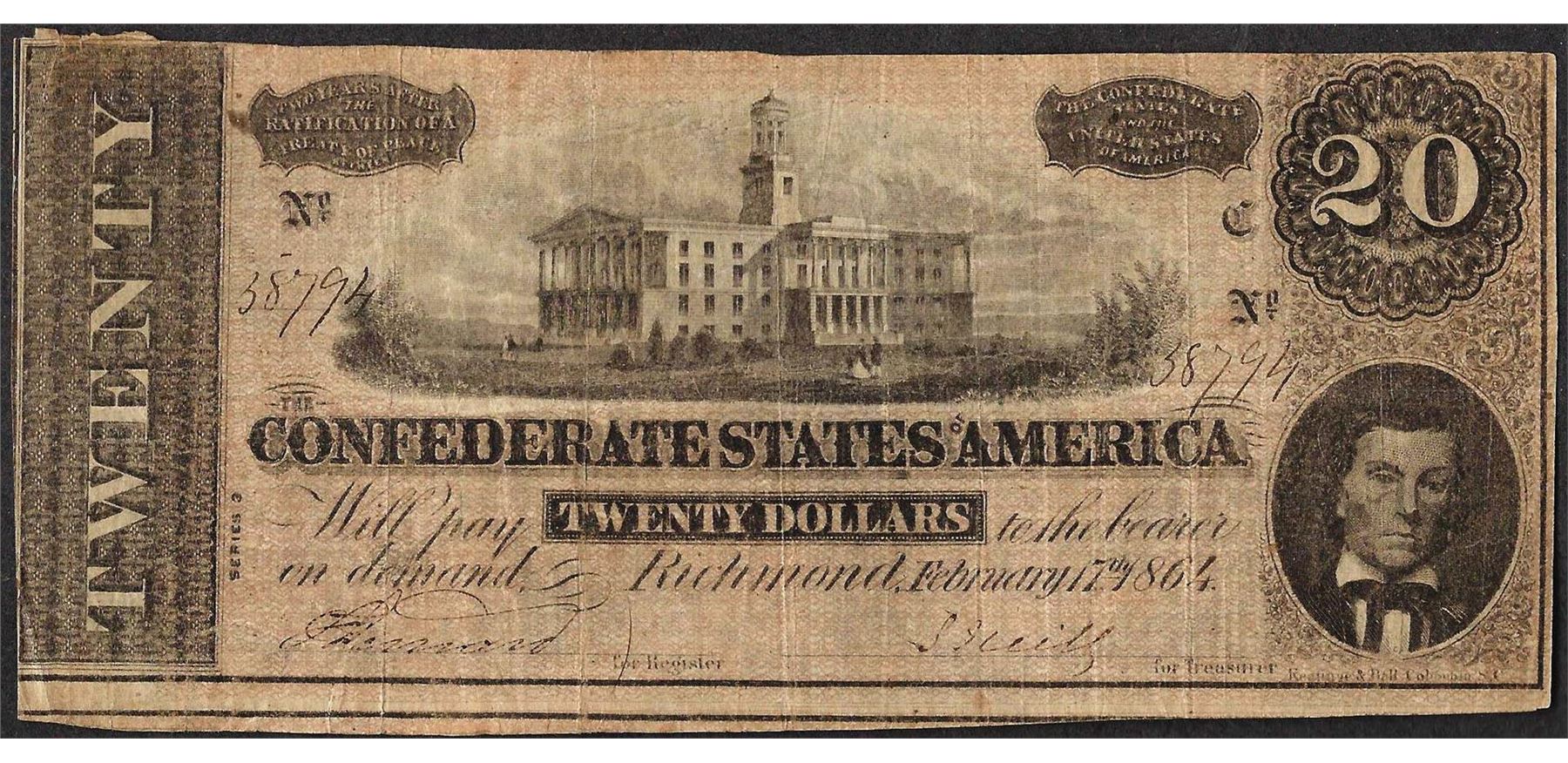 One 1864 $20 Confederate States of America Note.