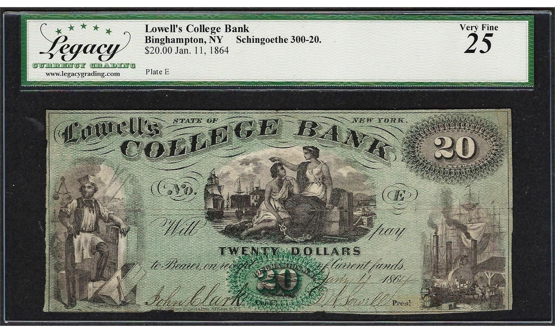 One 1864 $20 Lowell's College Bank Binghampton, NY Obsolete Note Legacy Very Fine 25. Legacy Graded.