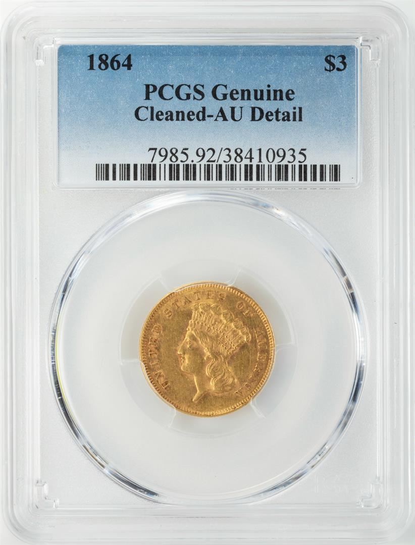 One 1864 $3 Indian Princess Head Gold Coin PCGS AU Details. PCGS Graded.