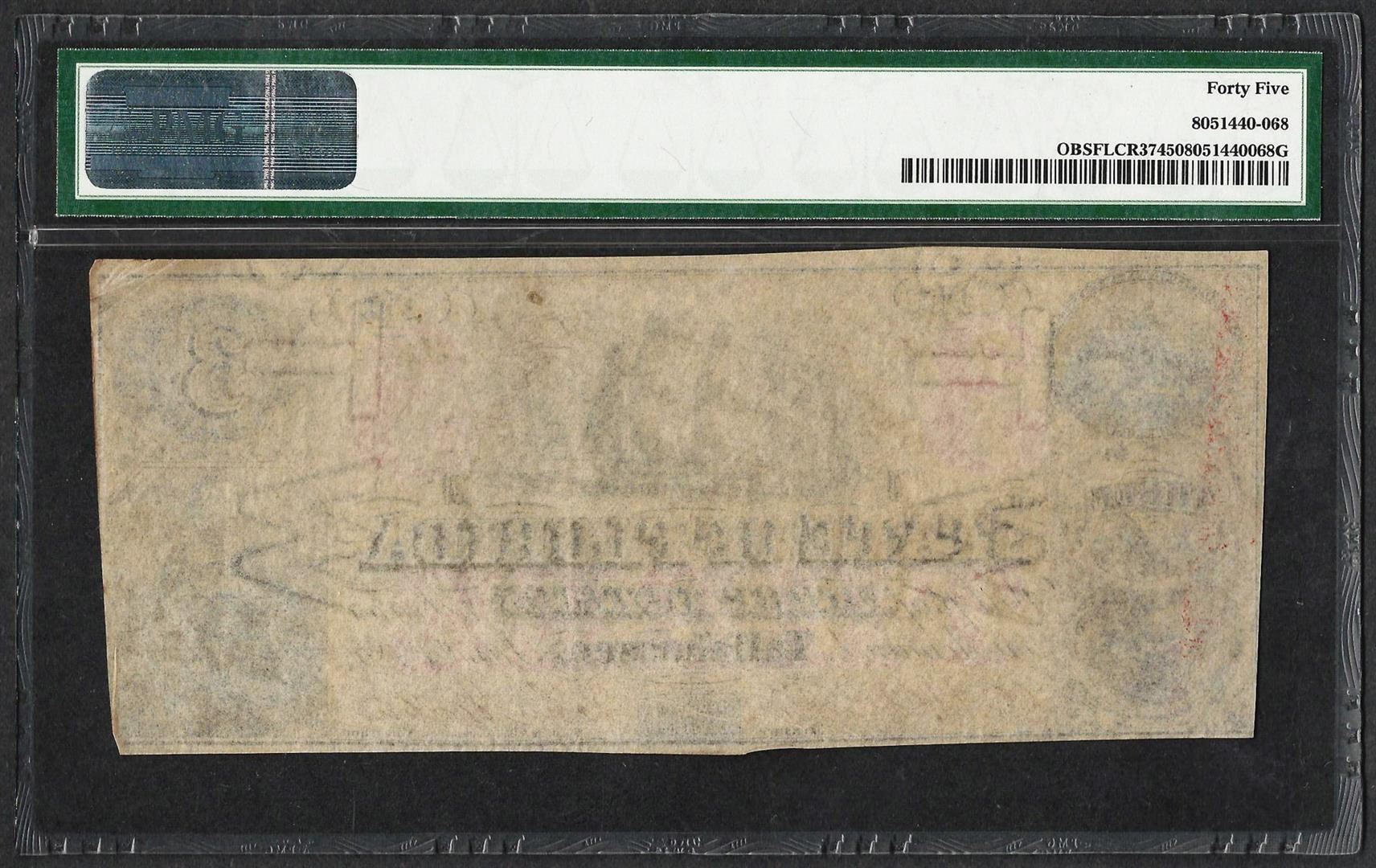 One 1864 $3 State of Florida Tallahassee Obsolete Note PMG Choice Extremely Fine 45. PMG Certified.