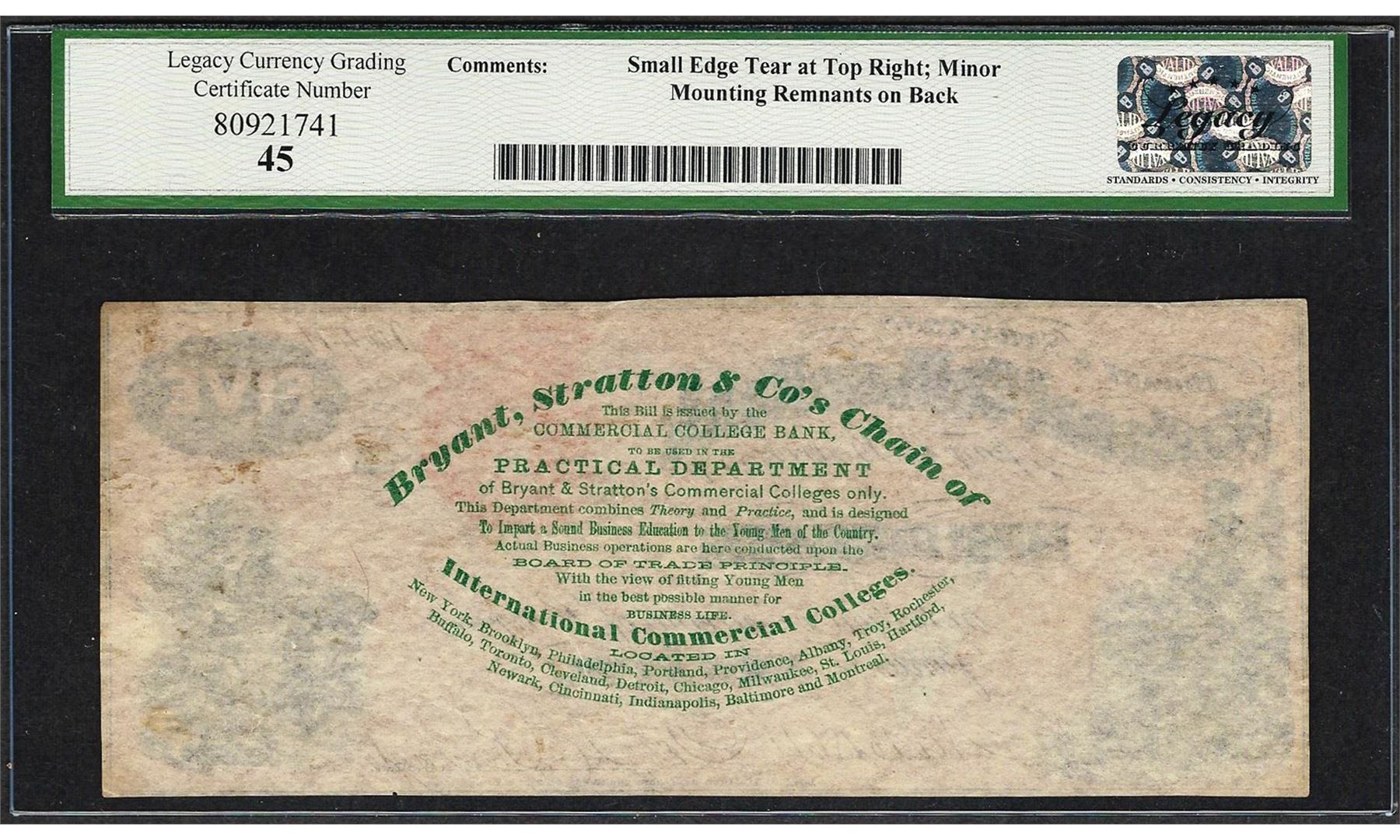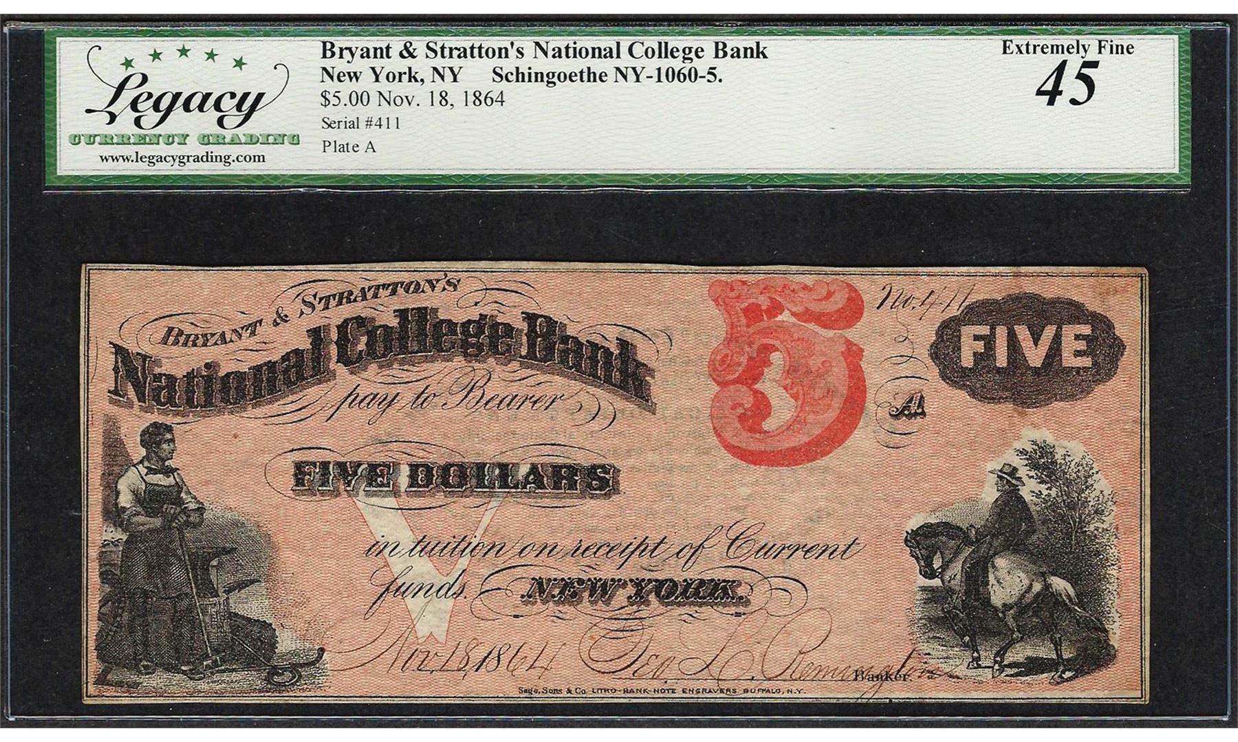 One 1864 $5 Bryant & Stratton's National College Bank, NY Note Legacy Extremely Fine 45. Legacy Graded.