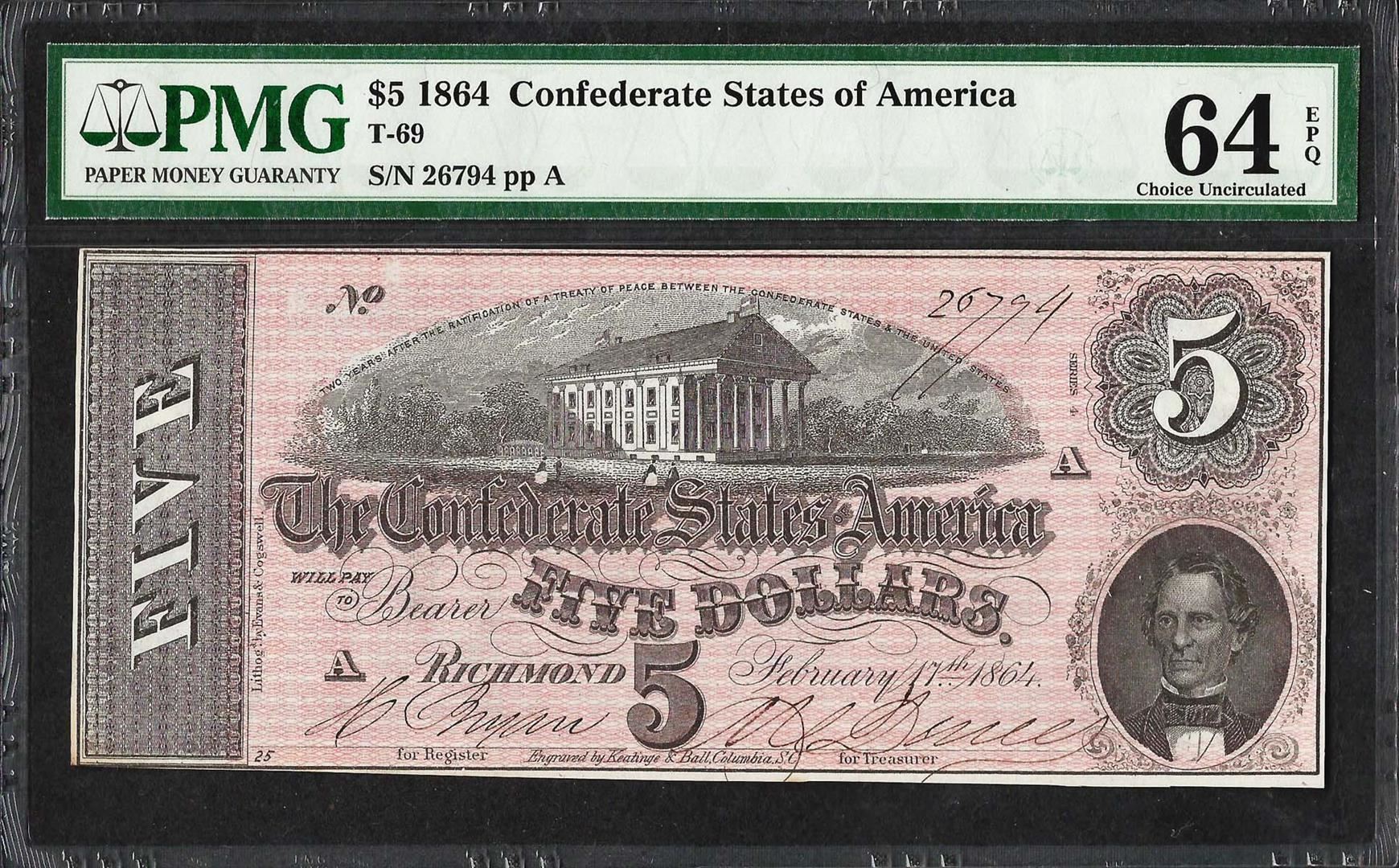 One 1864 $5 Confederate States of America Note T-69 PMG Choice Uncirculated 64EPQ. PMG Certified.