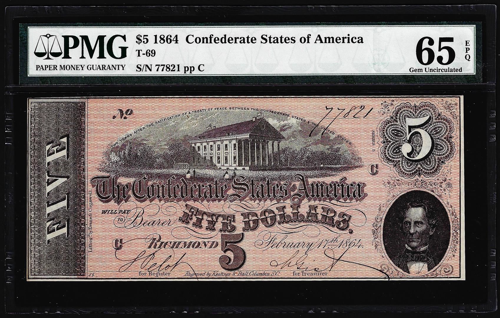 One 1864 $5 Confederate States of America Note T-69 PMG Gem Uncirculated 65EPQ. PMG Certified.