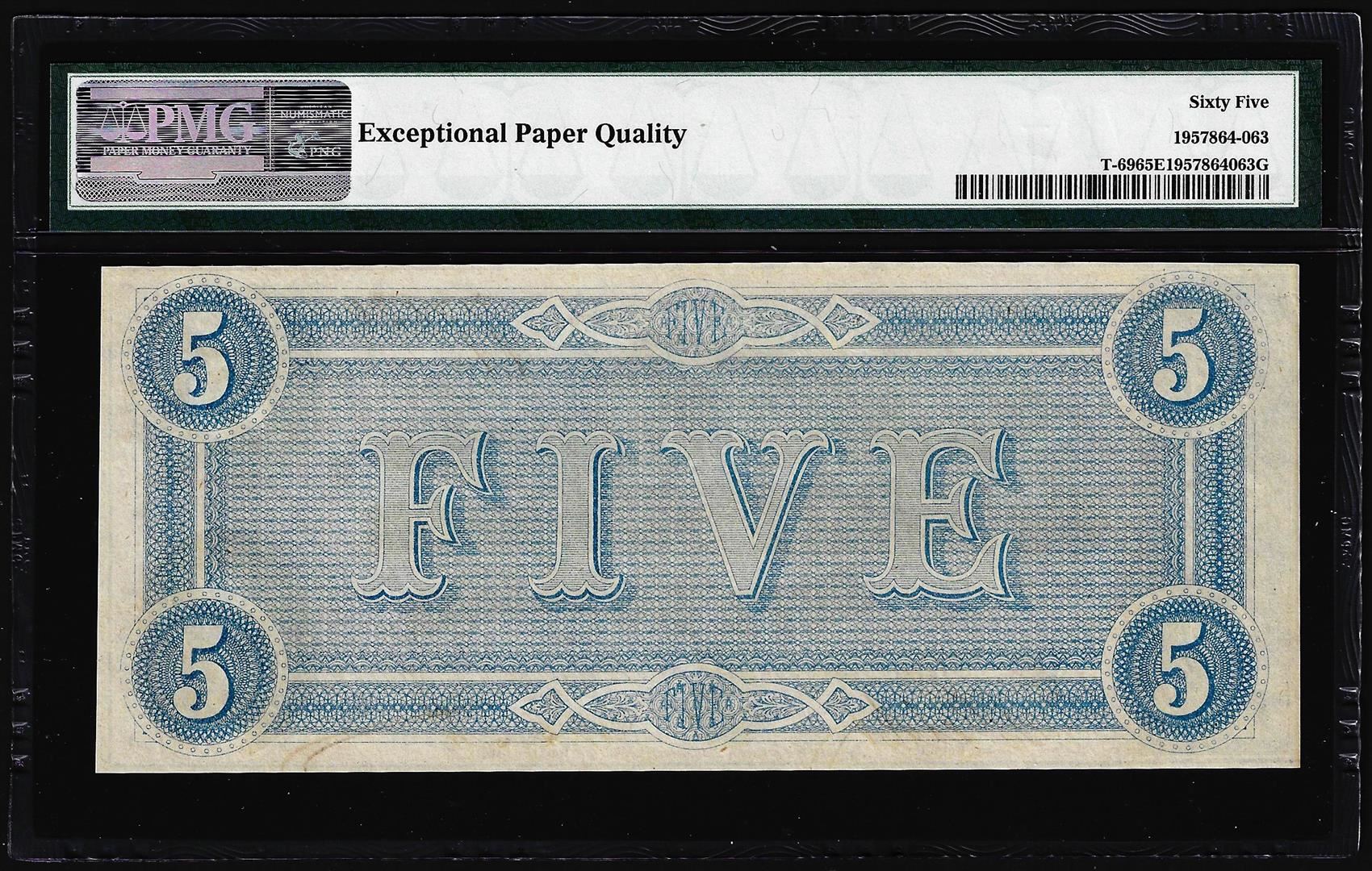 1864 $5 Confederate States of America Note T-69 PMG Gem Uncirculated 65EPQ