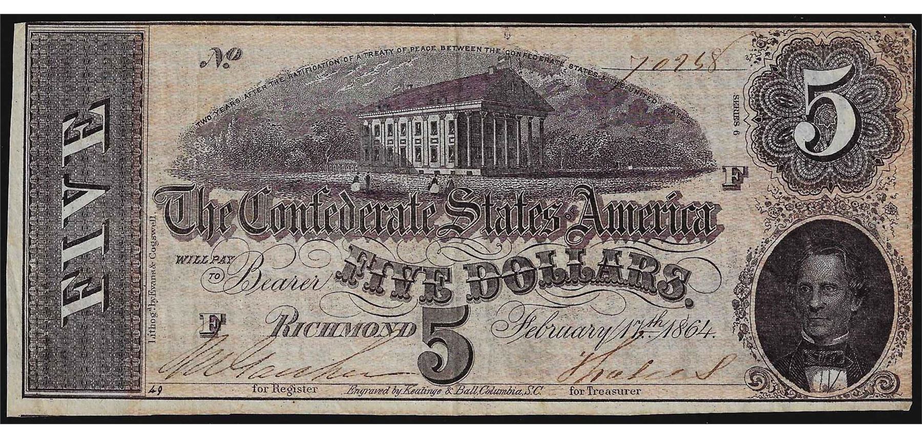 One 1864 $5 Confederate States of America Note.