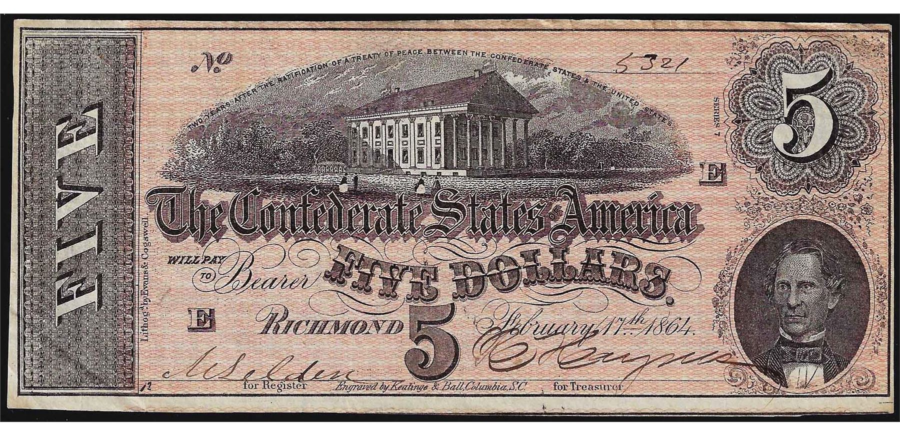 One 1864 $5 Confederate States of America Note.