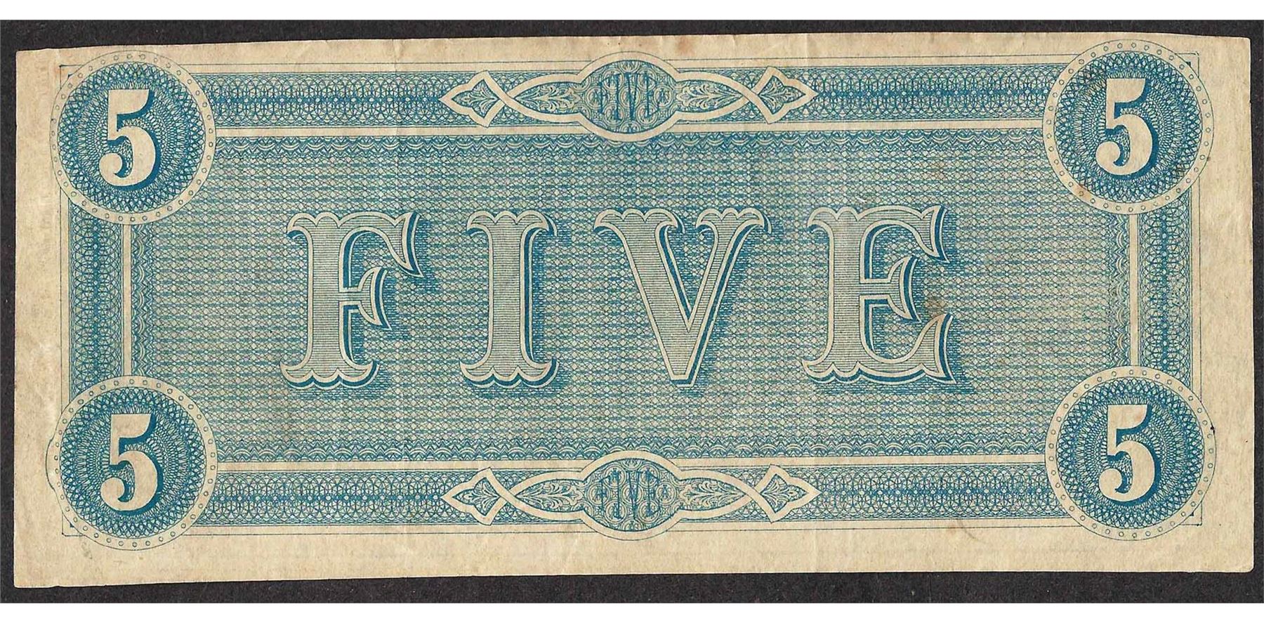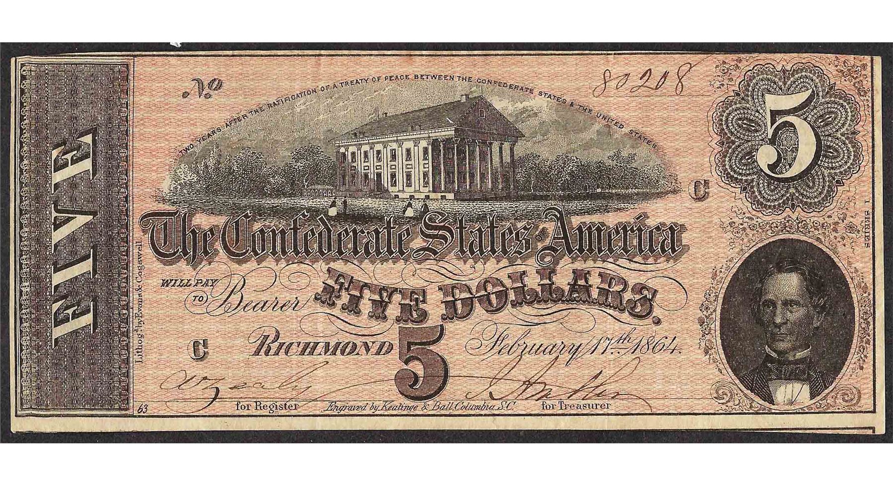 One 1864 $5 Confederate States of America Note.