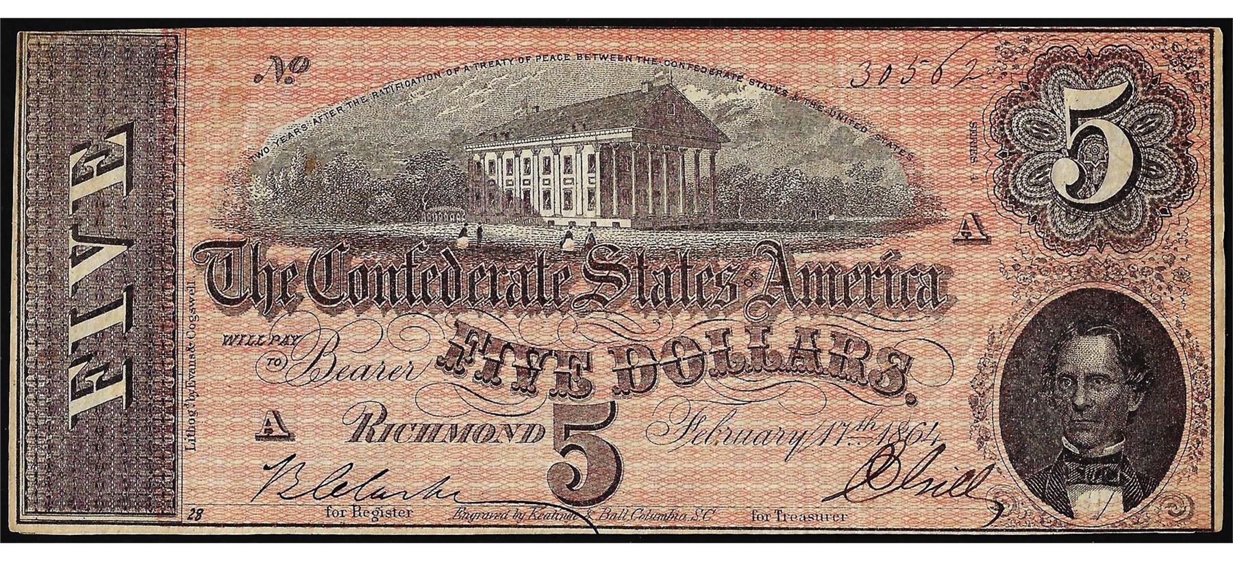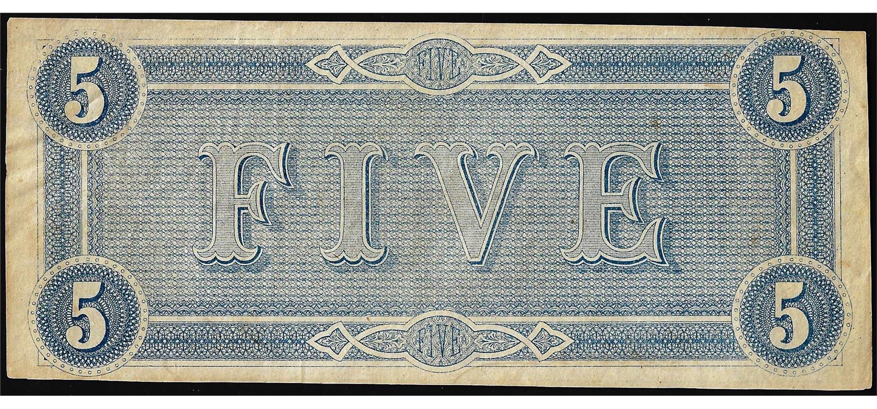 One 1864 $5 Confederate States of America Note.