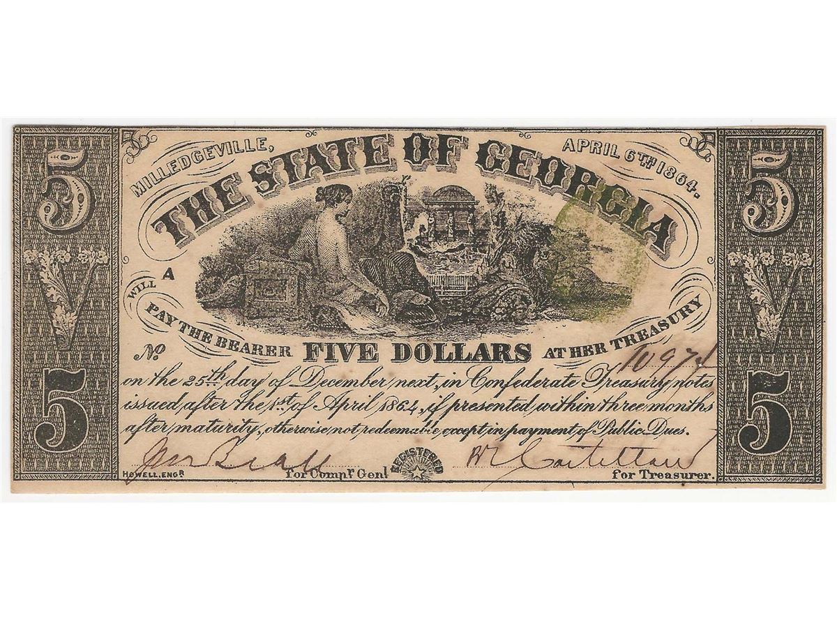 One 1864 $5 The Bank of Milledgeville Obsolete Note.