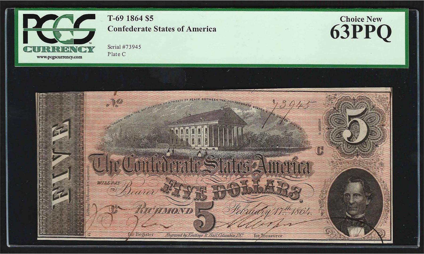 One 1864 $5 The Confederate States of America Note T-69 PCGS Choice New 63PPQ. PCGS Graded.