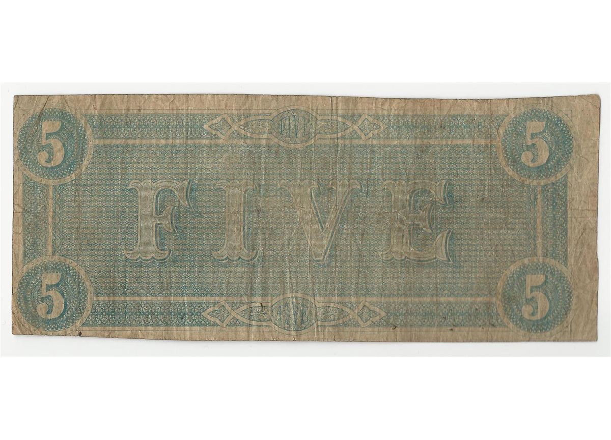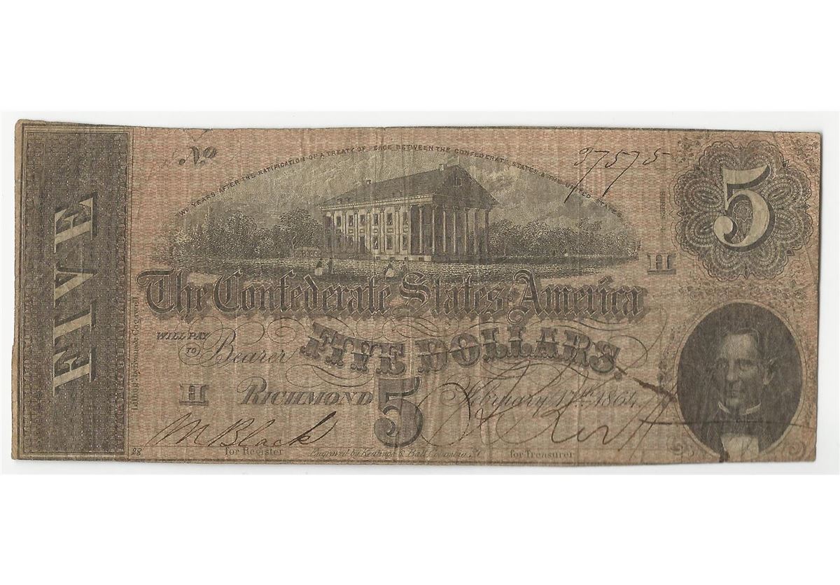 One 1864 $5 The Confederate States of America Note.