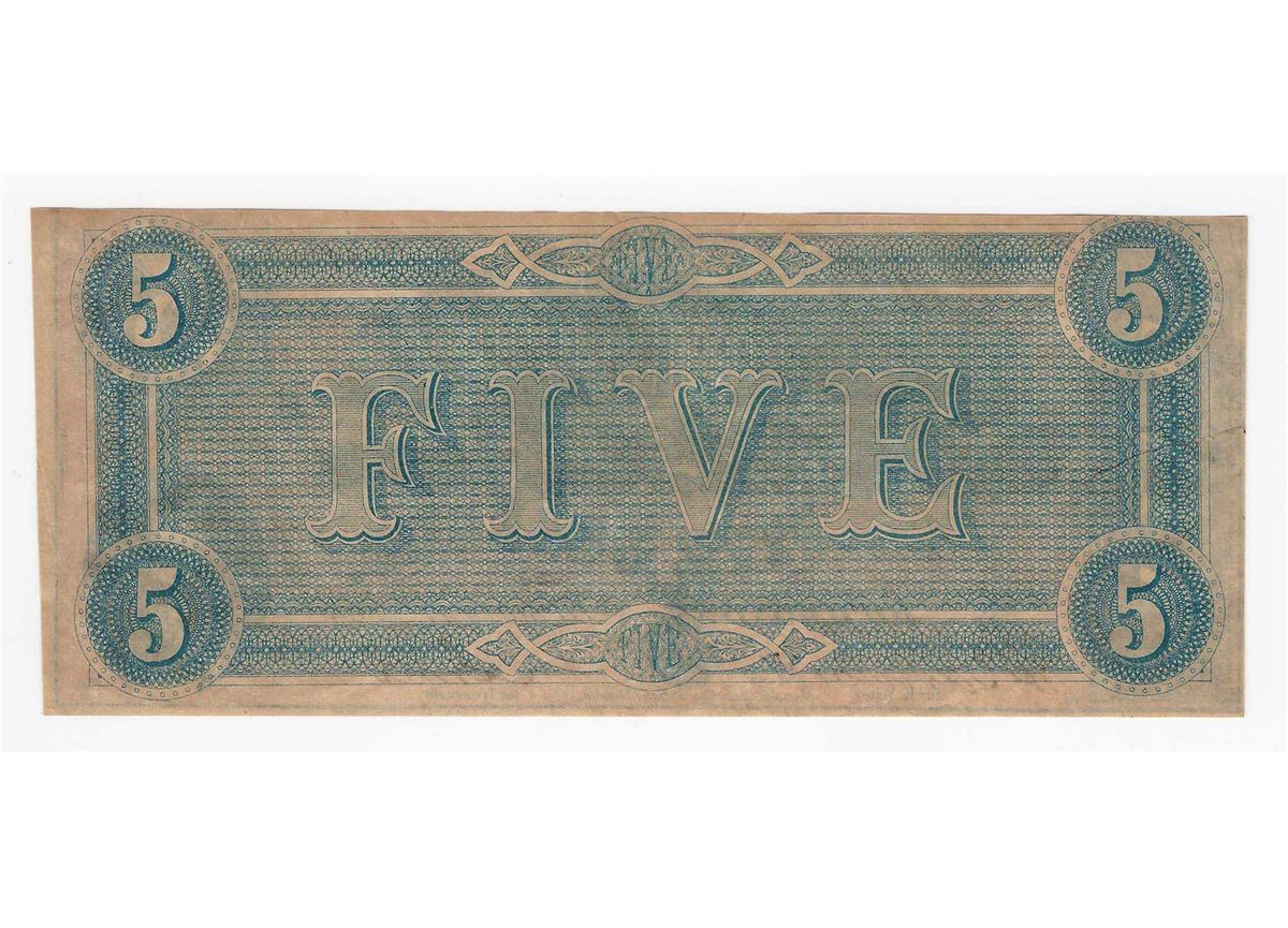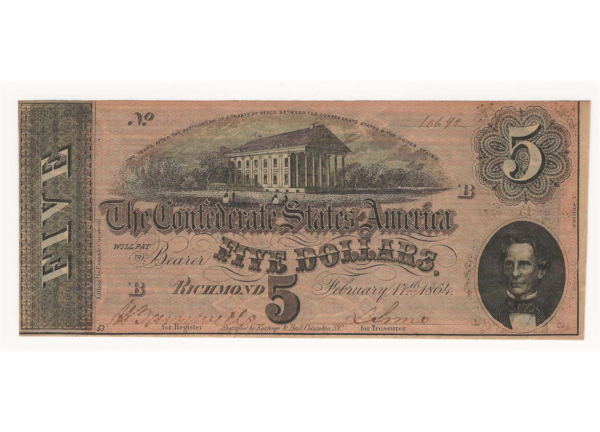 One 1864 $5 The Confederate States of America Note.