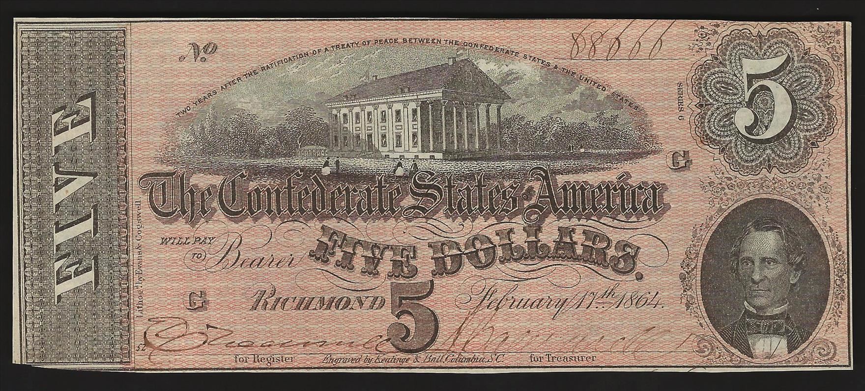 One 1864 $5 The Confederate States of America Note.