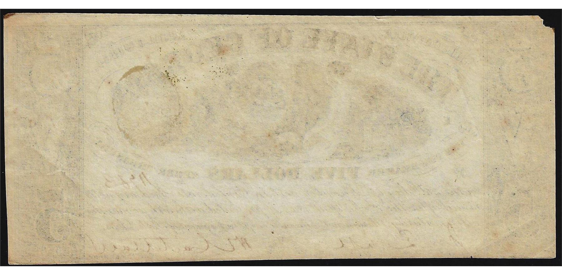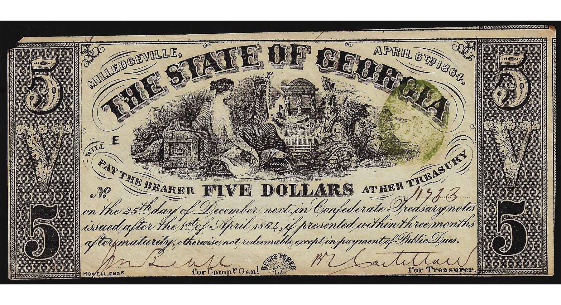 One 1864 $5 The State of Georgia Obsolete Bank Note.