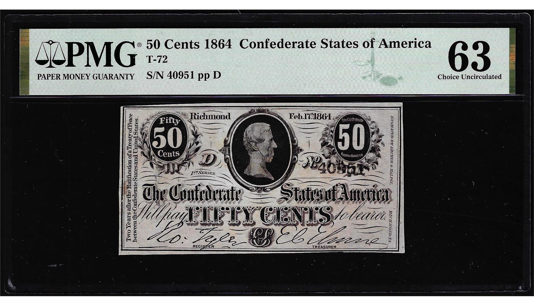 One 1864 50 Cents Confederate States of America Note T-72 PMG Choice Uncirculated 63. PMG Certified.
