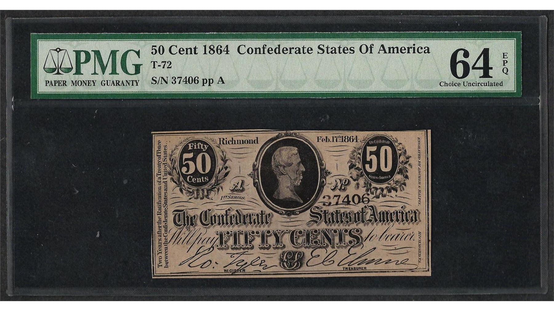 One 1864 50 Cents Confederate States of America Note T-72 PMG Choice Uncirculated 64EPQ. PMG Certified.