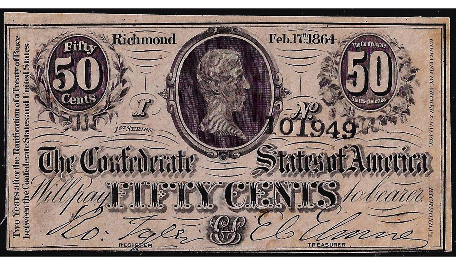 One 1864 50 Cents Confederate States of America Note.