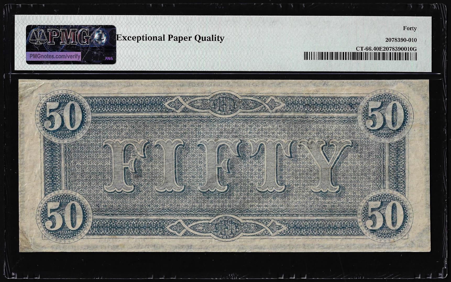 One 1864 $50 Confederate States Havana Counterfeit Note CT-66 PMG Extremely Fine 40EPQ. PMG Certified.