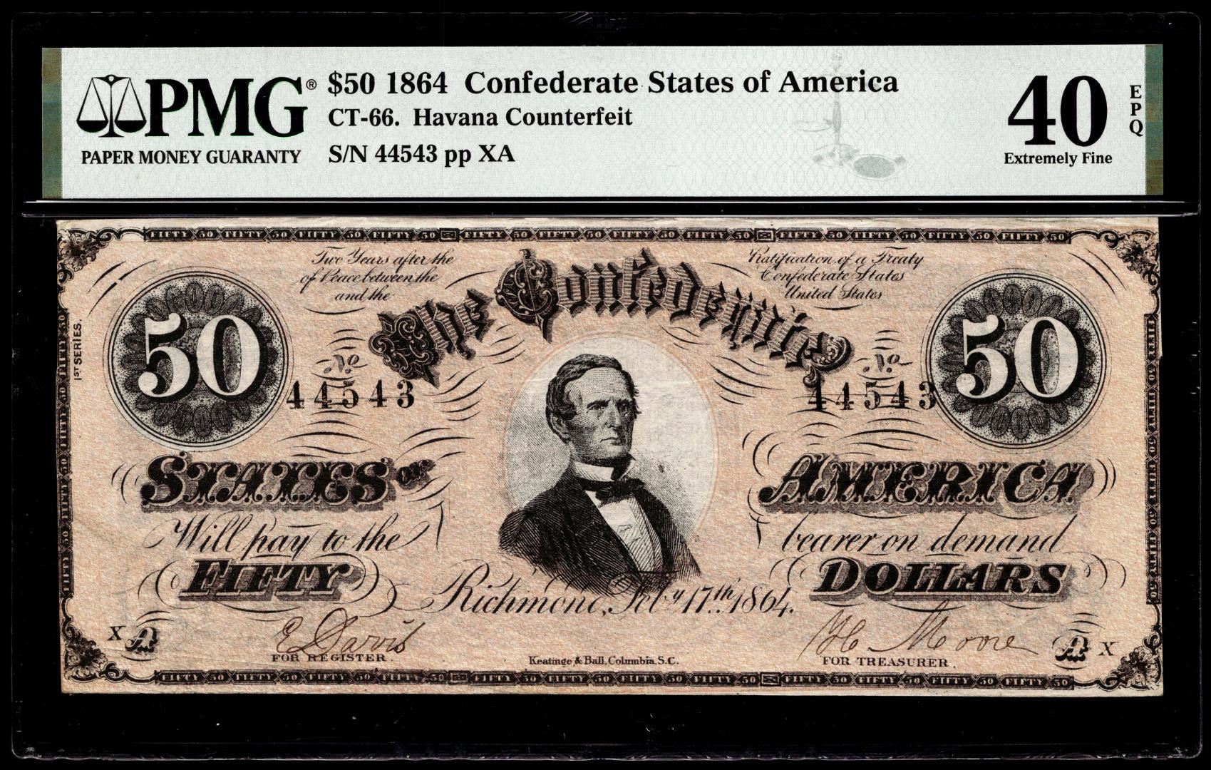 One 1864 $50 Confederate States Havana Counterfeit Note CT-66 PMG Extremely Fine 40EPQ. PMG Certified.