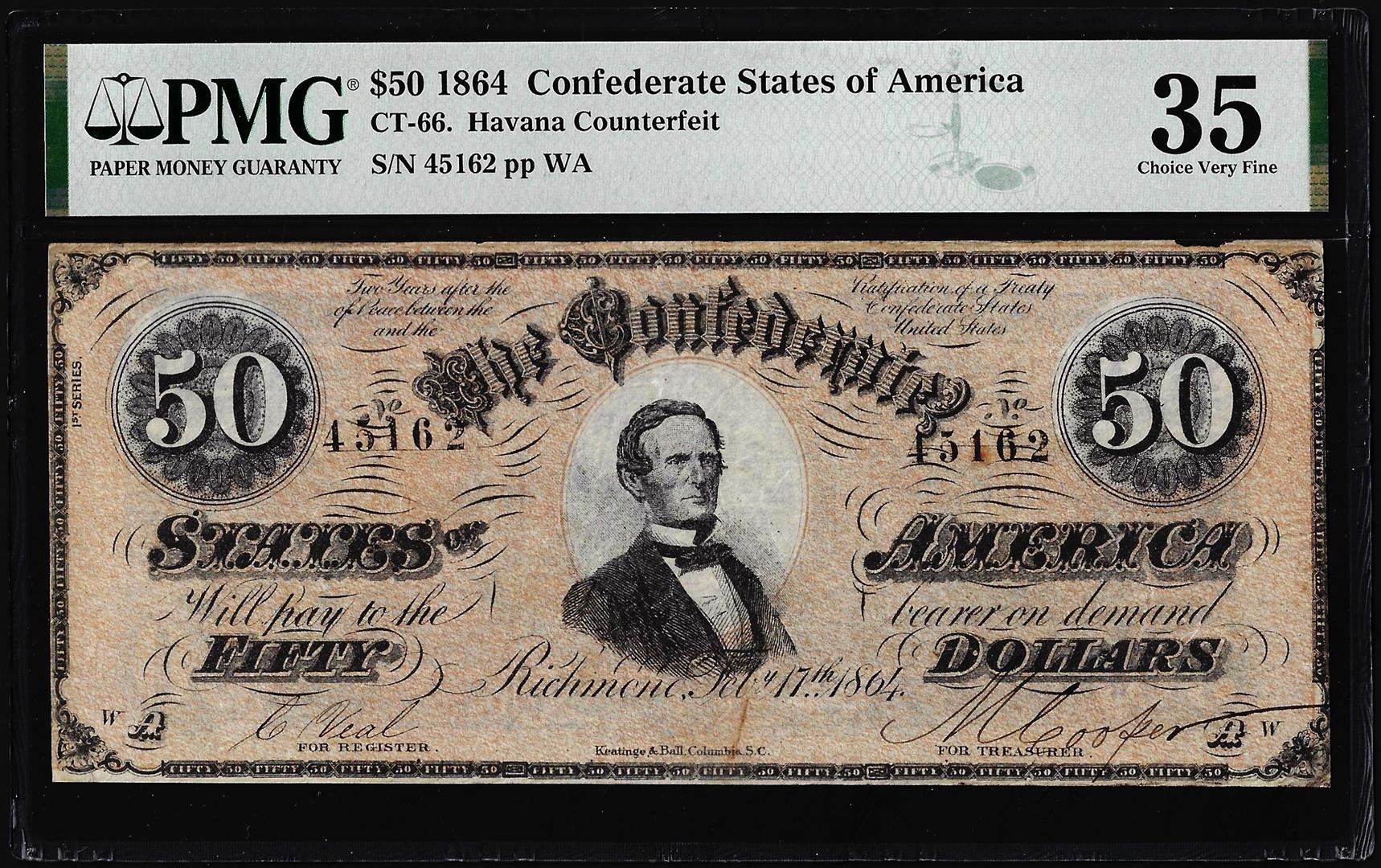 One 1864 $50 Confederate States of America Havana Counterfeit Note CT-66 PMG Choice VF35. PMG Certified.