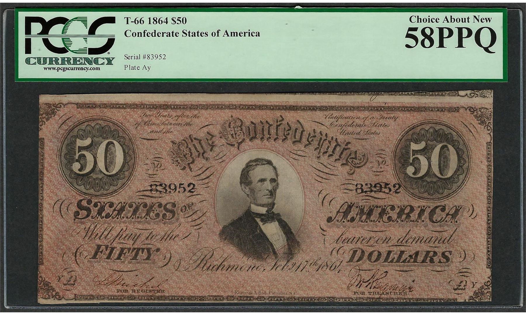 1864 $50 Confederate States of America Note T-66 PCGS Choice About New 58PPQ