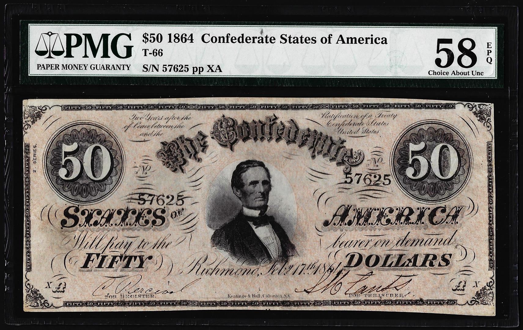 1864 $50 Confederate States of America Note T-66 PMG About Uncirculated 58EPQ