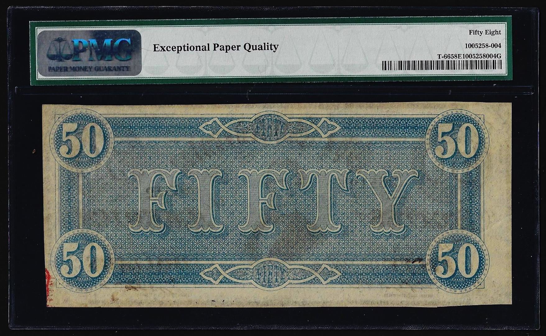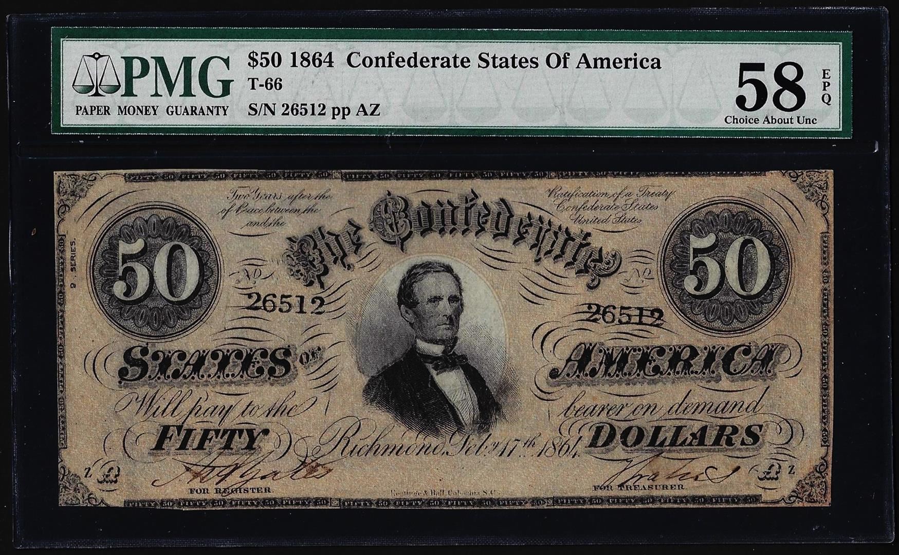1864 $50 Confederate States of America Note T-66 PMG Choice About Unc. 58EPQ