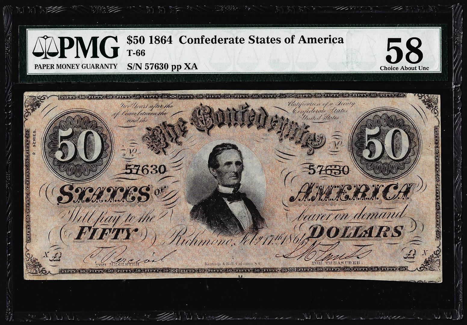 1864 $50 Confederate States of America Note T-66 PMG Choice About Uncirculated 58